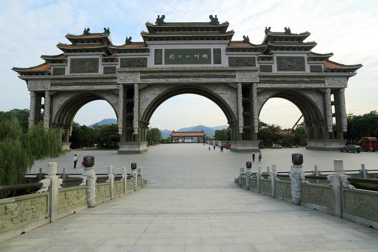 10:30前往被誉为“亚洲第一牌坊”的【顺峰山公园牌坊】游览约60分钟,则无疑成为此行的重要收获之一佛山顺德顺峰山公园入口牌坊,为三跨式巨型中式牌坊,整座牌坊宽88米,总高度38米,基座厚3米,主跨35米,整座楼牌重1.4万吨,牌坊正反两面拱门之间有16条用大理石雕琢而成的龙柱,单条重量就达25吨,全部在门楼顶上用螺丝栓紧倒挂,营造出凌空而下巧夺天工的气势其规模之大,造型之雄伟,图案之华丽,石艺之精湛均为国内外所罕见,因此享有中华第一牌坊的美誉,