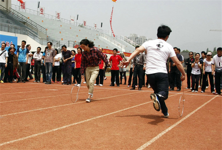 2、滚铁环接力:在限定的范围内,每队派出3名队员,互相碰、挤、撞,把竞争对手挤出赛场,最后在赛场内的队伍为获胜队。(其它队员作为拉拉队或补队员)赛场秩序需听从裁判。