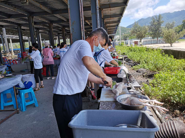 10:40到达大鹏海滨基地野炊园,分队,每队选出一个队长。由队长选派出几名同事前往指定区域拣柴、杀鸡、杀鱼、摘菜。另安排几人前往库房领食材、配料及桌椅等用具。