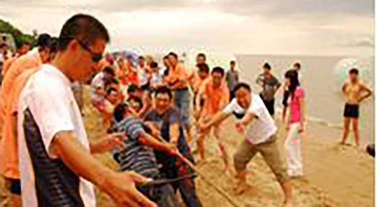 15:20抵达云海沙滩,在导游带须下开始【趣味团建】,星球大战、毛毛虫、袋鼠跳、大脚掌、无敌风火轮、一圈到底、巨人脚步、珠行万里、沙滩排球,足球、拔河绳等等(所有沙滩趣味项目由导游或领队自行组织,不含分队服装)