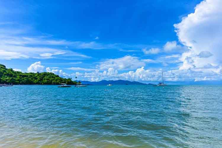 蓝天白云、湛蓝海水,、踩沙、戏水、游泳,